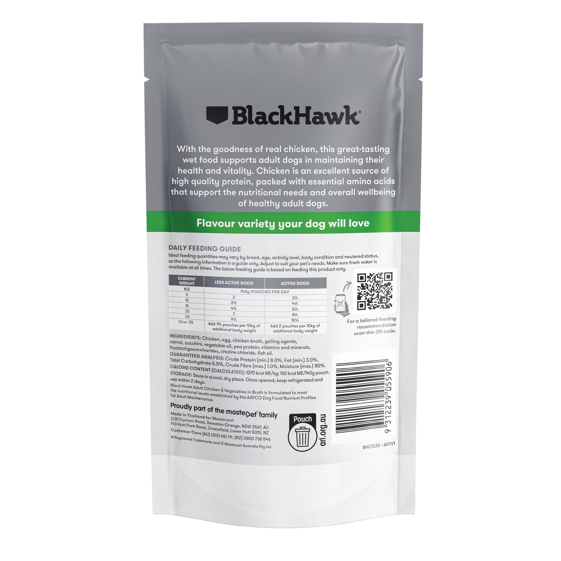 The Black Hawk Original Adult Chicken & Vegetables Wet Dog Food is a complete wet meal designed for adult dogs, ideal for pet parents looking to add variety and flavour to everyday feeding without compromising balanced nutrition. It suits dogs who enjoy softer textures or need a more enticing mealtime, whether served on its own or mixed through dry food as a tasty topper.