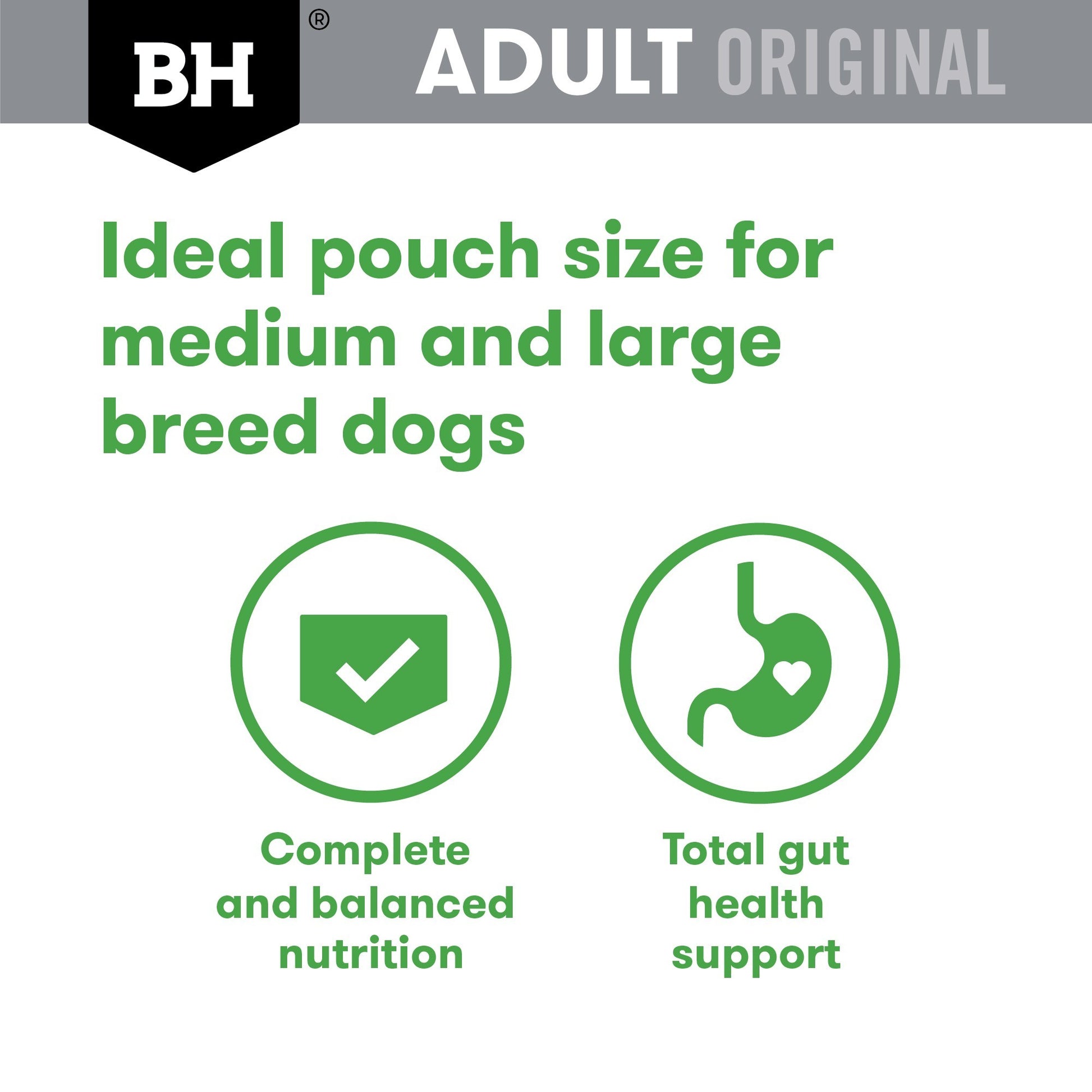 For medium to large breed: we recommend using the 140g pouches as a more appropriate volume of wet food to mix with their dry food. For each 1 x 140g pouch you feed per day, we recommend reducing the amount of kibble by 40g.
