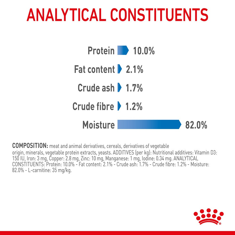 Royal Canin Light Weight Care in Gravy (formerly Ultra Light) is a nutritionally complete and balanced wet diet specifically formulated for adult cats that have a tendency to gain weight. Maintaining a healthy weight is vital for a cat's longevity and mobility, yet many indoor cats lead sedentary lifestyles that can lead to excess kilograms. This recipe features tender slices of meat in a delicious gravy, providing a 19% reduction in calorie intake compared to Royal Canin Adult Instinctive, helping your cat reach their ideal weight without sacrificing mealtime satisfaction.
