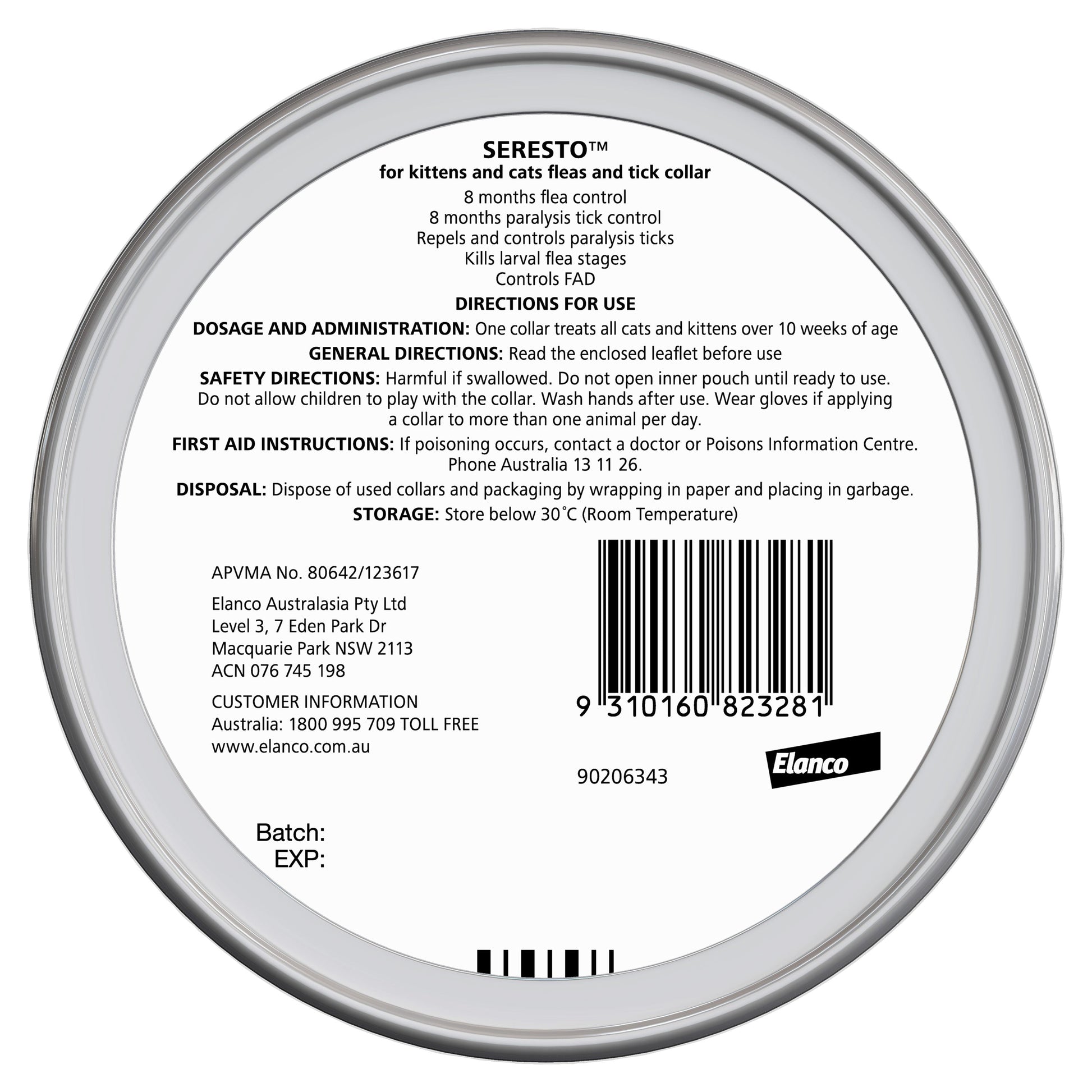 Seresto Flea & Tick Collar for Kittens and Cats from 10 Weeks, Single Pack, Longest-lasting Protection, Odourless, Adjustable and Water-Resistant Cat Collar. Seresto is the longest-lasting flea & paralysis tick protection for kittens and cats. It is an easy to use, odourless, water resistant cat collar that protects cats from fleas and paralysis ticks for 8 months. Seresto harnesses innovative technology, allowing for the controlled release of low doses of the active ingredients into the cat's coat. It works fast and on contact, so there's no need for fleas and ticks to bite! Seresto kills adult fleas on your cat, larval flea stages in their surroundings, and controls flea allergy dermatitis. Seresto reduces the transmission of cat scratch disease and flea tapeworm. Safe to use on kittens from 10 weeks of age and any weight.
