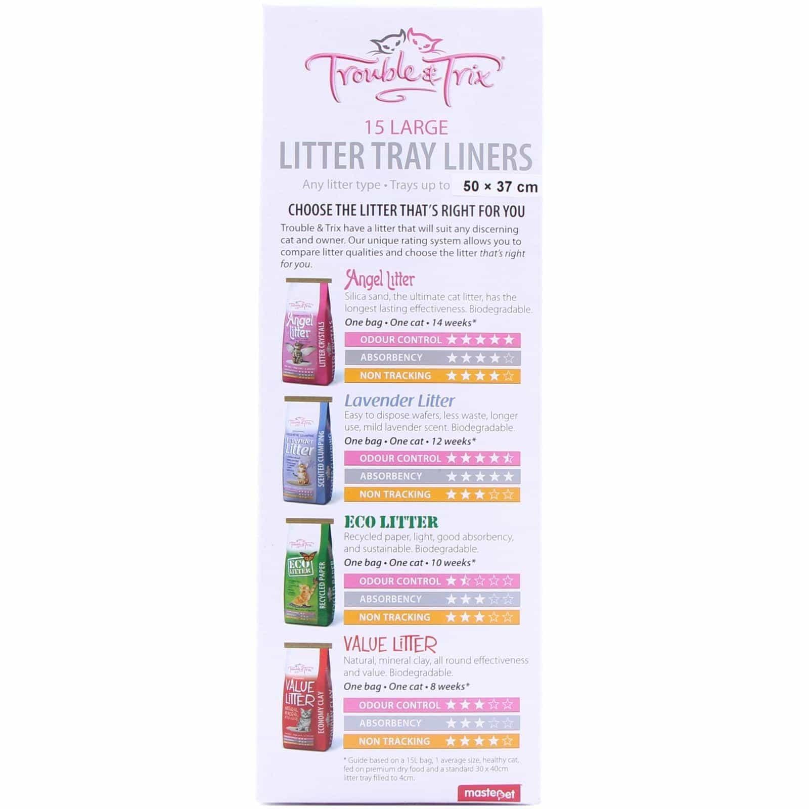 The Trouble and Trix Litter Tray Liners make cleaning your cat's litter tray quick, easy and hygenic! Simply fit the plastic liner around your litter tray and fill with your favourite litter as normal. Then when your litter is ready for a change, slip the liner off of your tray and dispose. The liners come with handy twist ties to secure your litter during disposal.