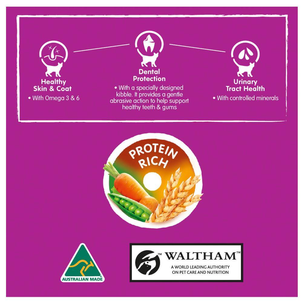 Whiskas make delicious, 100% complete and balanced recipes for cats at all stages of life. This complete and balanced dry food contains all the protein, vitamins, minerals and energy that your adult cat needs. With delicious crunchy tuna flavoured biscuits, this formula also includes specially designed Dental Protection Plus pieces that act to scrub teeth clean with every chew to help reduce plaque and tartar buildup.