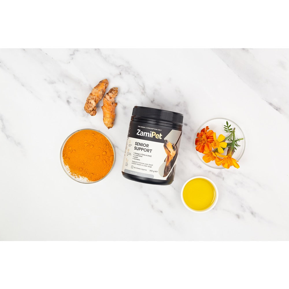 ZamiPet Senior Support is a great tasting, breakable chew containing Omega-3, Turmeric, CoQ10, L-Carnitine and Lutein, which may help alleviate symptoms associated with age-related decline in dogs.