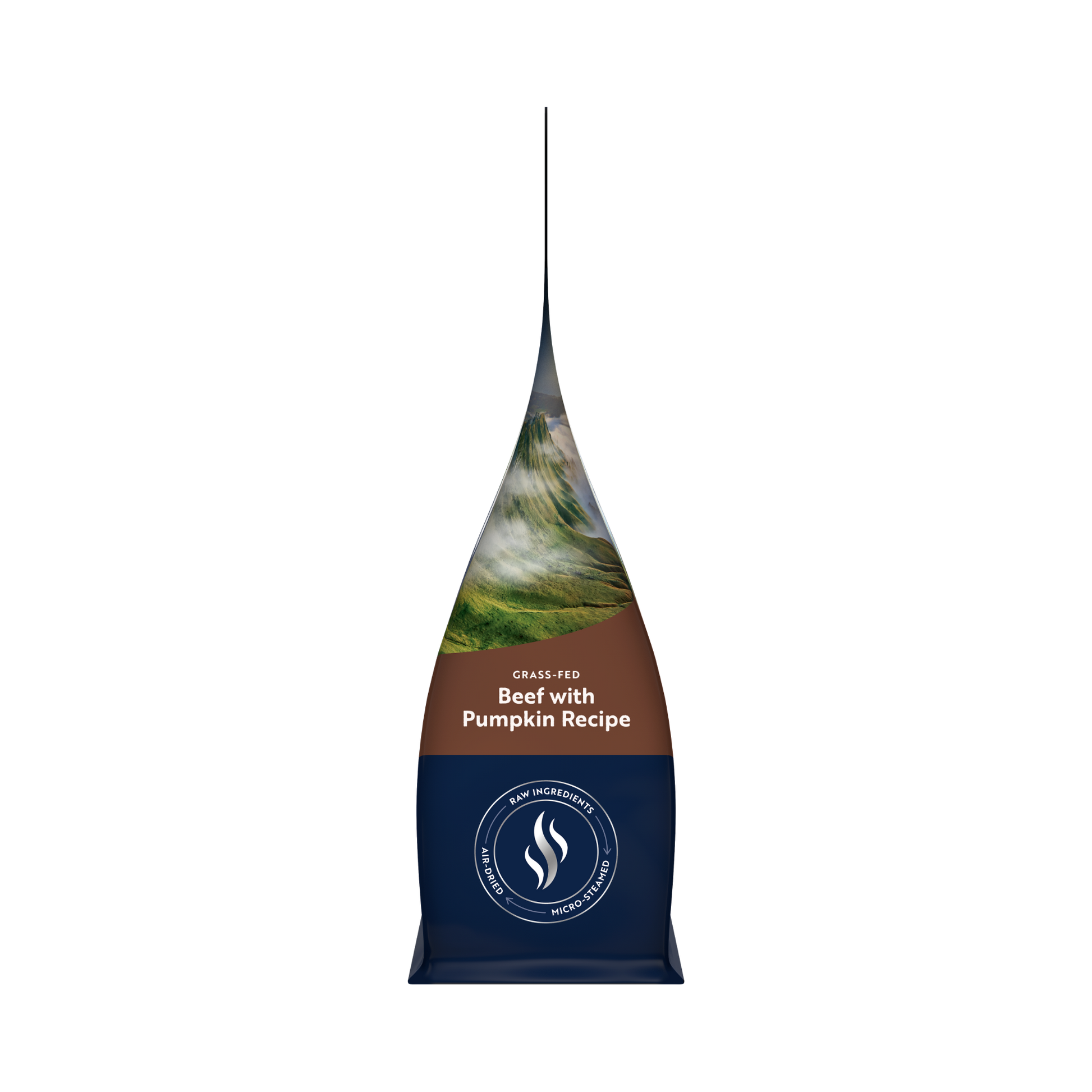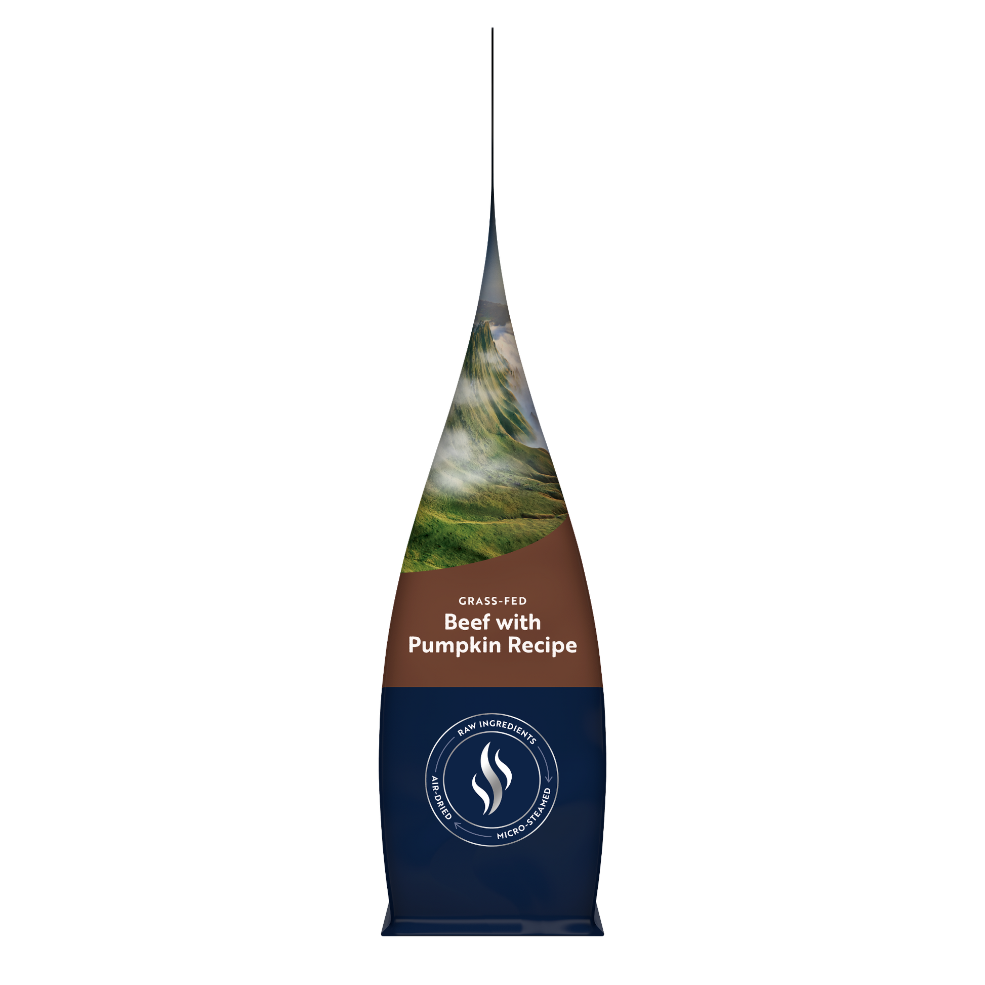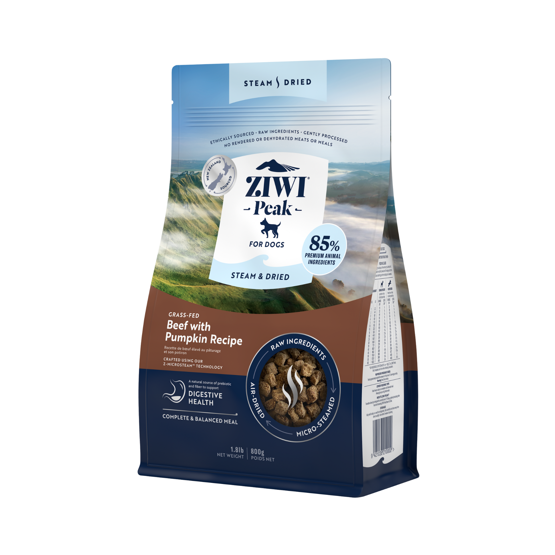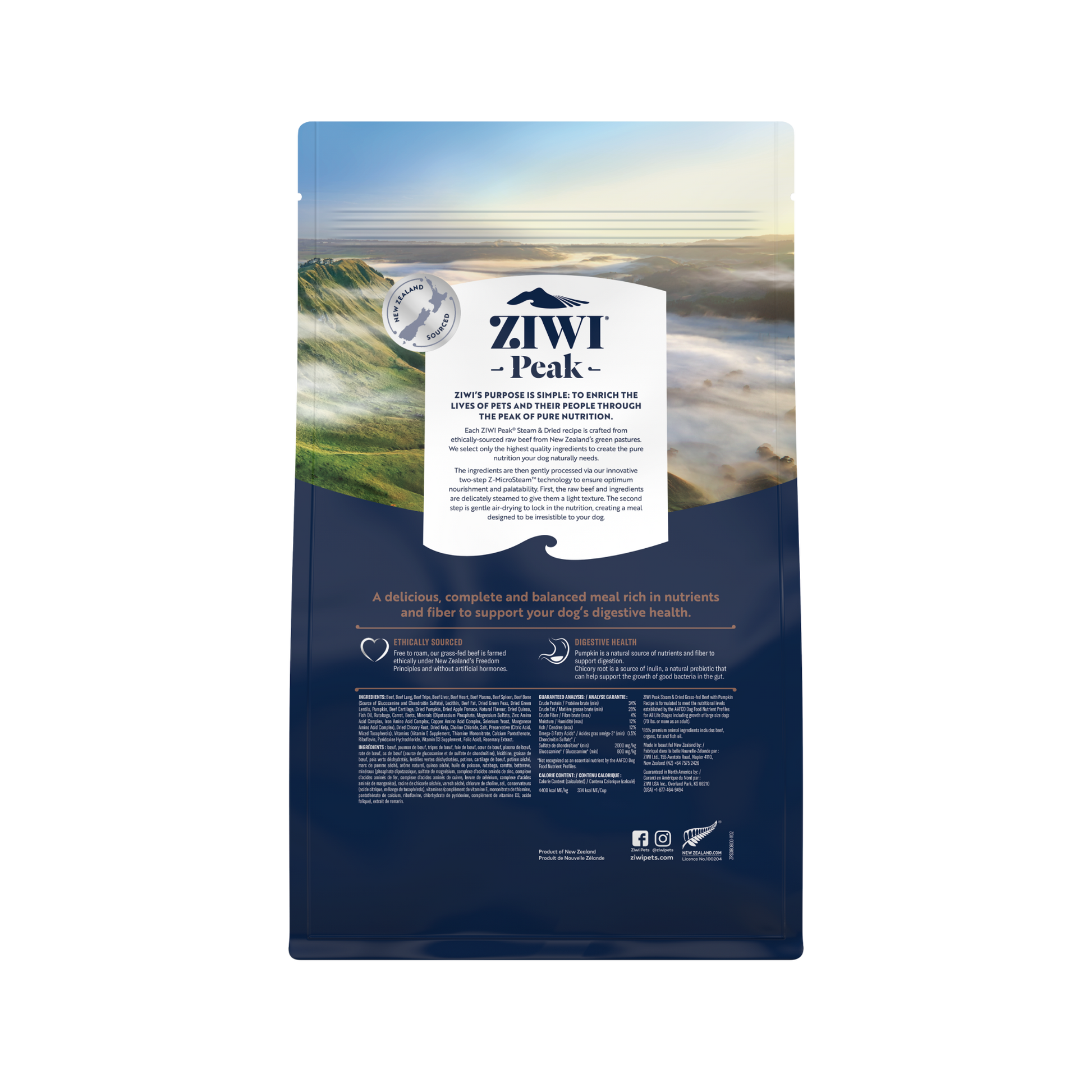 Ziwi Peak Steam & Dried Grass-fed Beef with Pumpkin Dry Dog Food is crafted as a premium, complete, and balanced meal for dogs of all breeds and all life stages, offering a nutrient-rich alternative to raw feeding through gently steamed and air-dried grass-fed beef, organs, fish oil, and fibre-rich pumpkin. Suitable for dogs with sensitive digestion, this 85% animal-ingredient recipe is ideal for supporting gut health, strong muscles, and everyday vitality, with added chicory root providing natural prebiotics to nourish healthy gut bacteria; it is not recommended for dogs requiring a low-protein therapeutic diet.